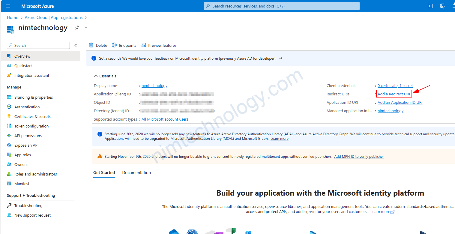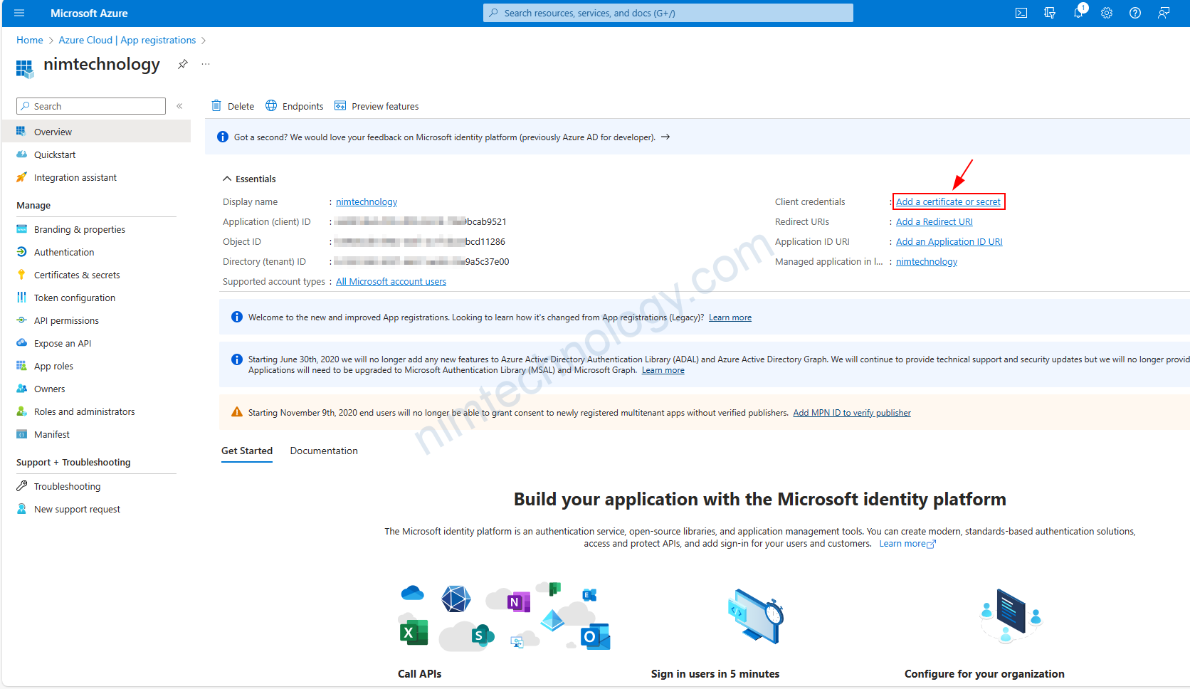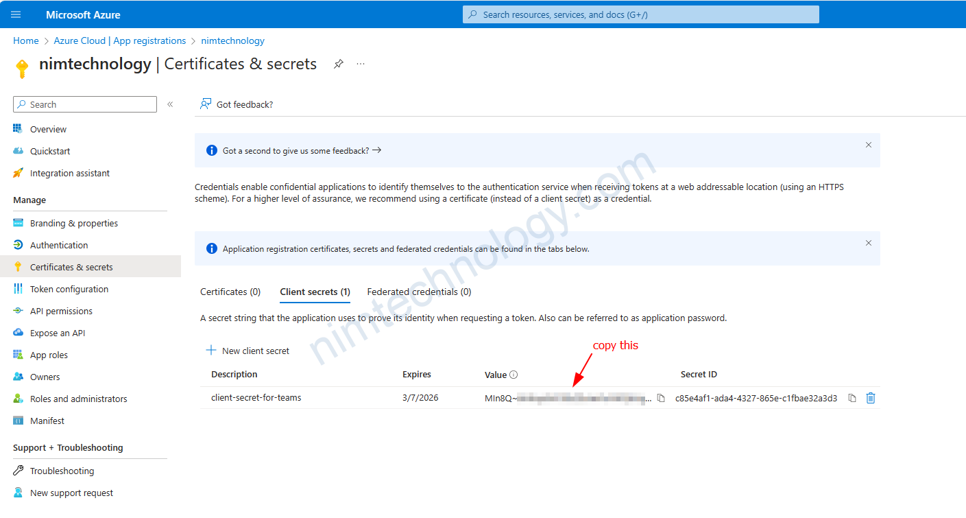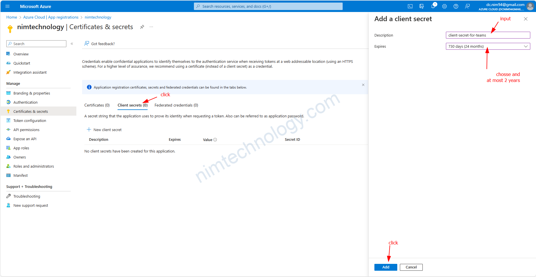 Tiếp đến bạn cần click vào “add certificate and secret” để tại client secret.
