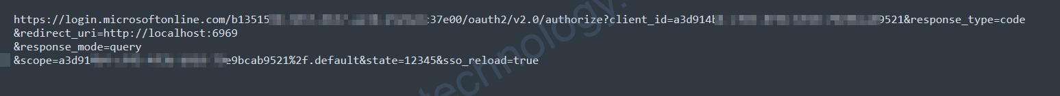https://login.microsoftonline.com/<tenant-id>/oauth2/v2.0/authorize?client_id=<client-id> &response_type=code &redirect_uri=<redirect-uri> &response_mode=query &scope=<client-id>%2f.default&state=12345&sso_reload=true