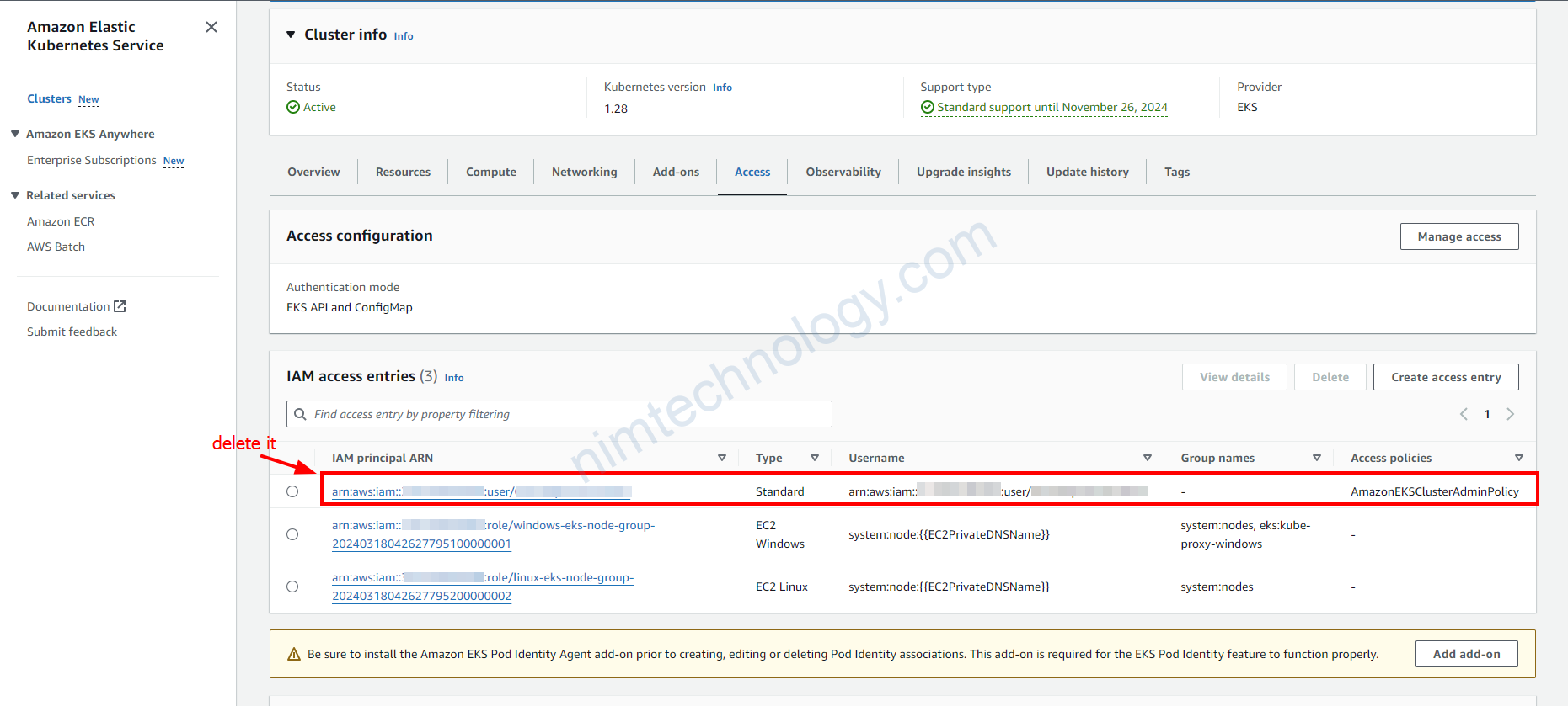 │ Error: creating EKS Access Entry (dev-devops-nimtechnology:arn:aws:iam::313363500340:user/CloudOpsAutomation): operation error EKS: CreateAccessEntry, https response error StatusCode: 409, RequestID: 10305417-ff5f-4734-b413-533be64ea6e4, ResourceInUseException: The specified access entry resource is already in use on this cluster.