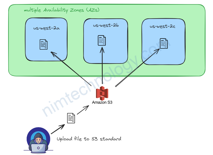 S3 Standard: achieved by storing data redundantly across multiple Availability Zones (AZs) within a region. If one AZ goes down, your data will still be available.
