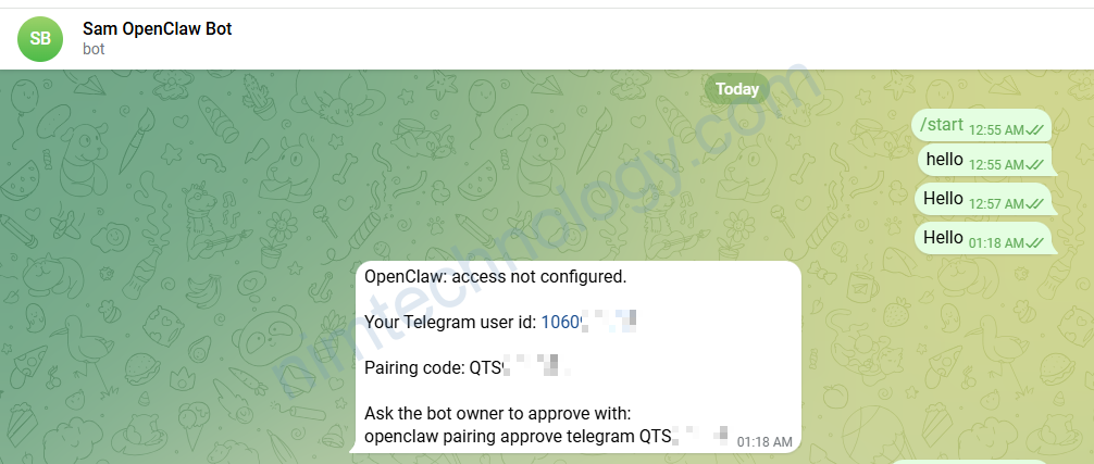 Sau đó DM bot mới của bạn trên Telegram. Nó sẽ trả lời bằng một mã ghép nối. Hãy chấp thuận nó: