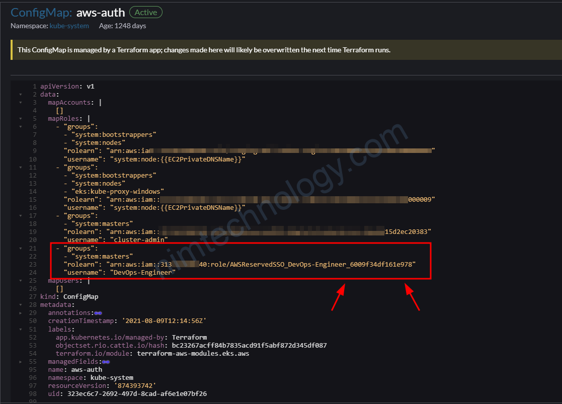Bạn sẽ cần copy Federated users để sửa configmap: aws-auth trong kube-system namespace