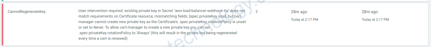 CannotRegenerateKey: User intervention required: existing private key in Secret “aws-load-balancer-webhook-tls” does not match requirements on Certificate resource, mismatching fields: [spec.privateKey.size], but cert-manager cannot create new private key as the Certificate’s .spec.privateKey.rotationPolicy is unset or set to Never. To allow cert-manager to create a new private key you can set .spec.privateKey.rotationPolicy to ‘Always’ (this will result in the private key being regenerated every time a cert is renewed)