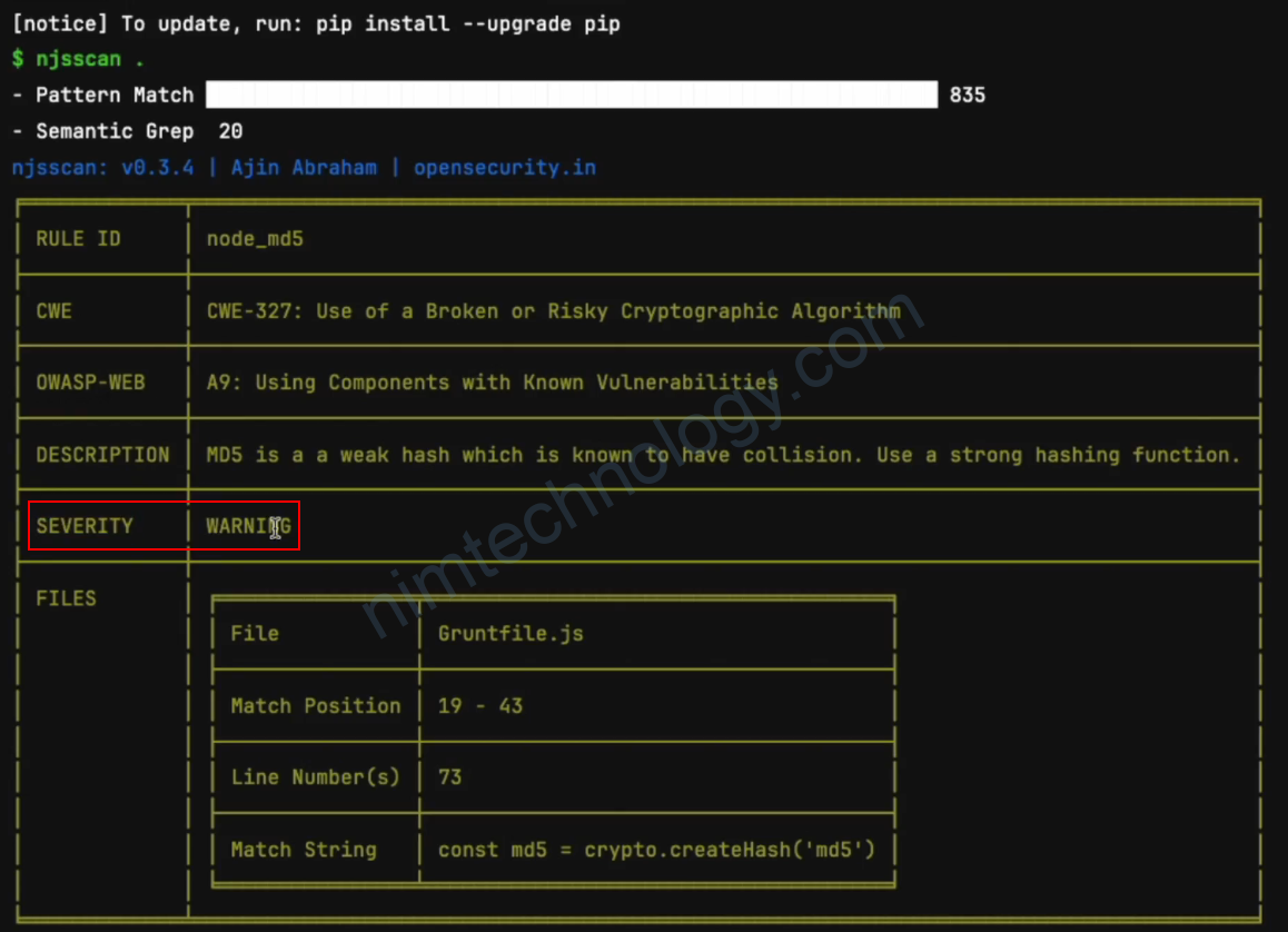 Bạn có thể thấy chúng ta có issue với severity là warning về việc sử dụng MD5.