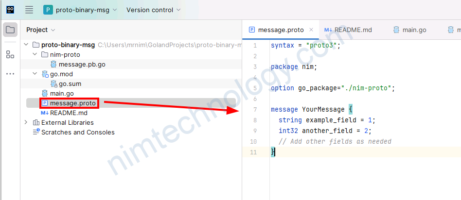 syntax = "proto3"; package nim; option go_package="./nim-proto"; message YourMessage { string example_field = 1; int32 another_field = 2; // Add other fields as needed }